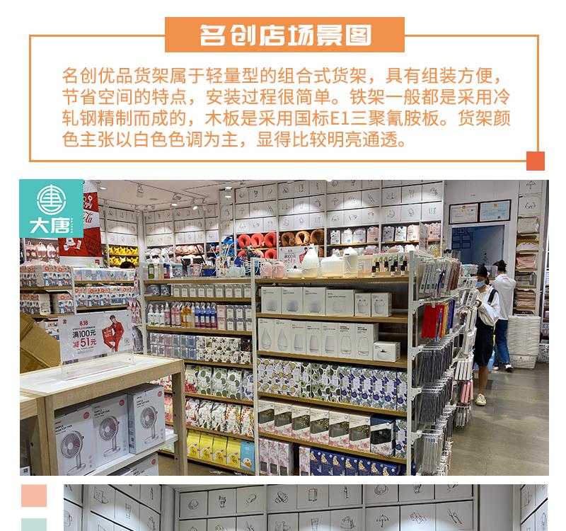產品描述:名創優品貨架屬于輕量型的組合式貨架,具有組裝方便,節省空間的特點。
